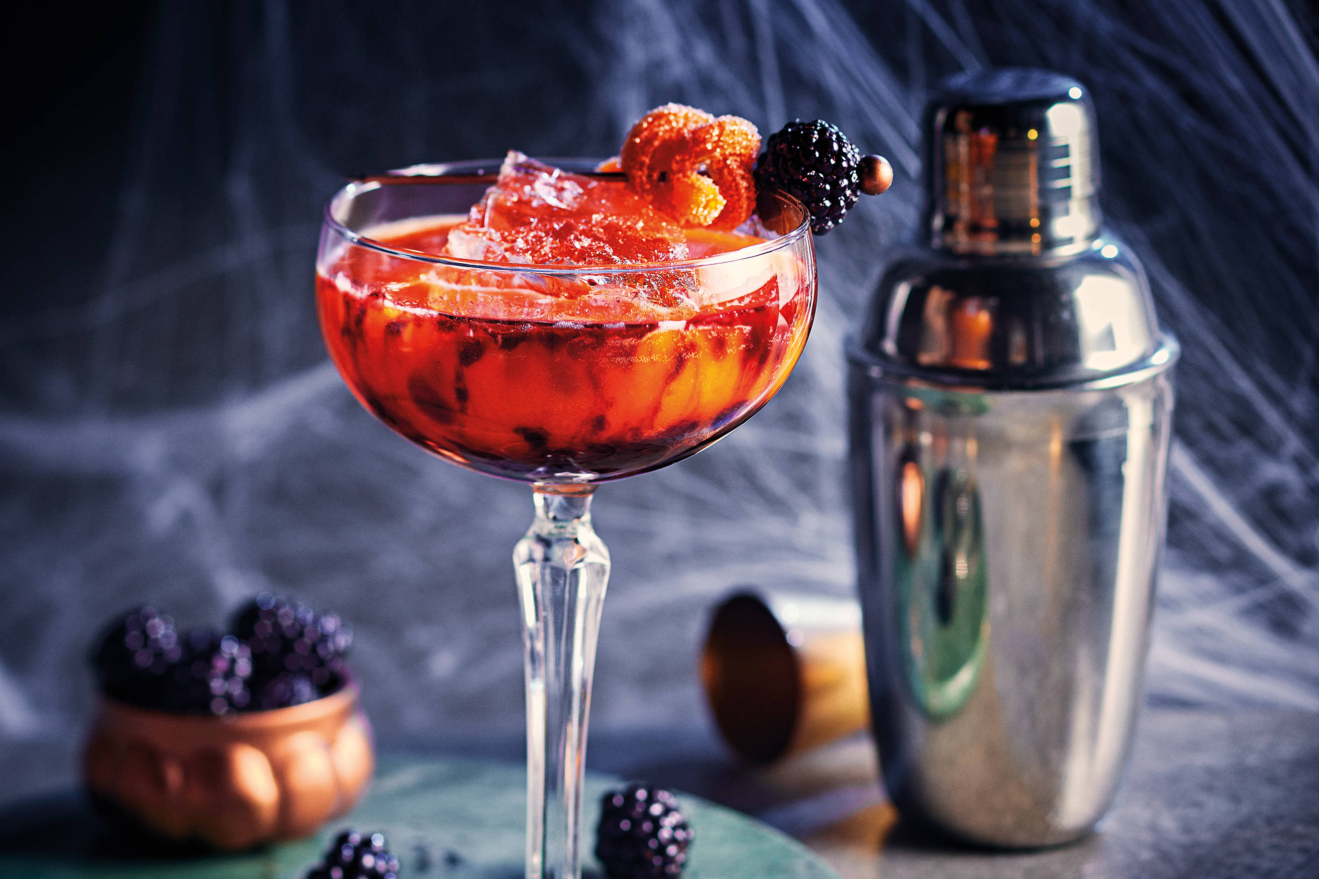 - Place the blackberry on a cocktail pick. Tie the orange sweet into a knot and thread it into the cocktail pick too.