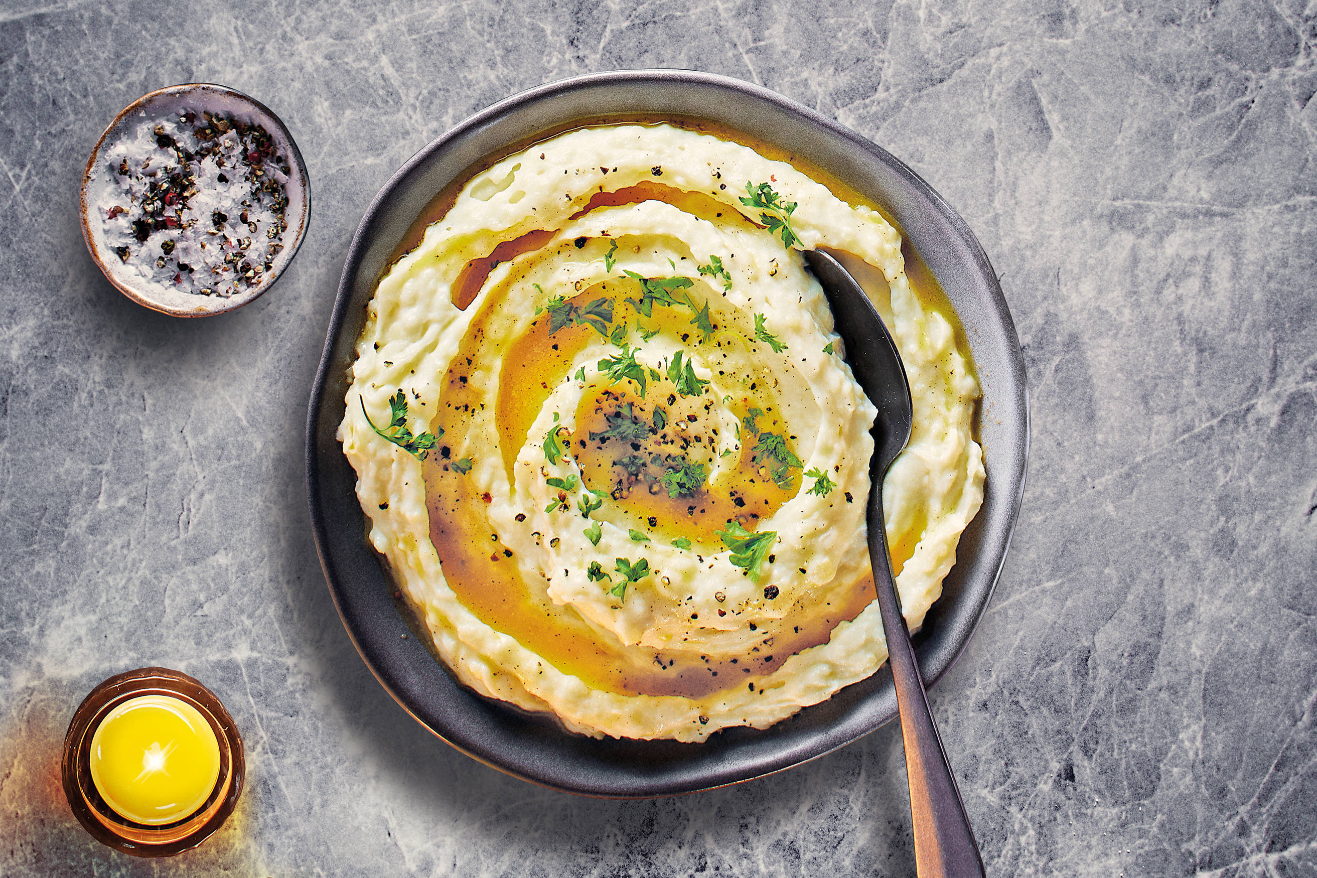 - Put back on a low heat and add the butter, rosemary, some black pepper and cream and mash well until smooth.