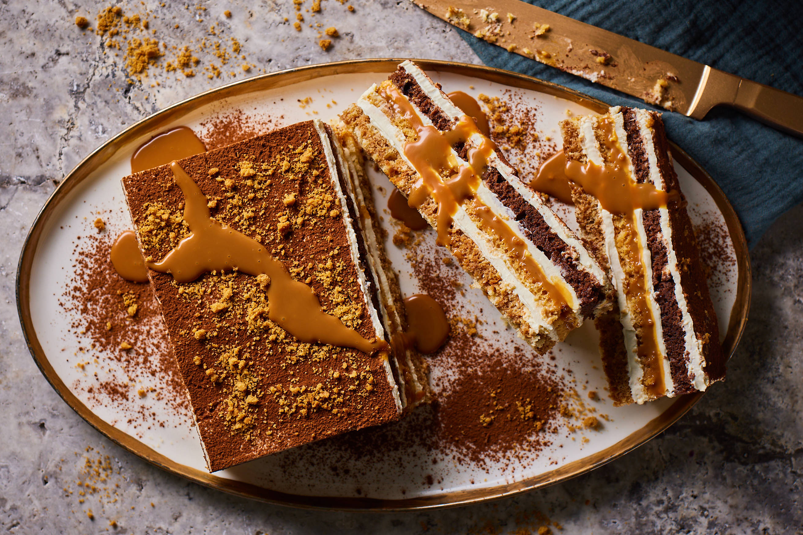 - Pour over a generous layer of caramel, sprinkle with the ginger biscuit crumb and cover with the mascarpone cream, add a layer of chocolate cake drizzled with the espresso, then smooth over the remaining cream.