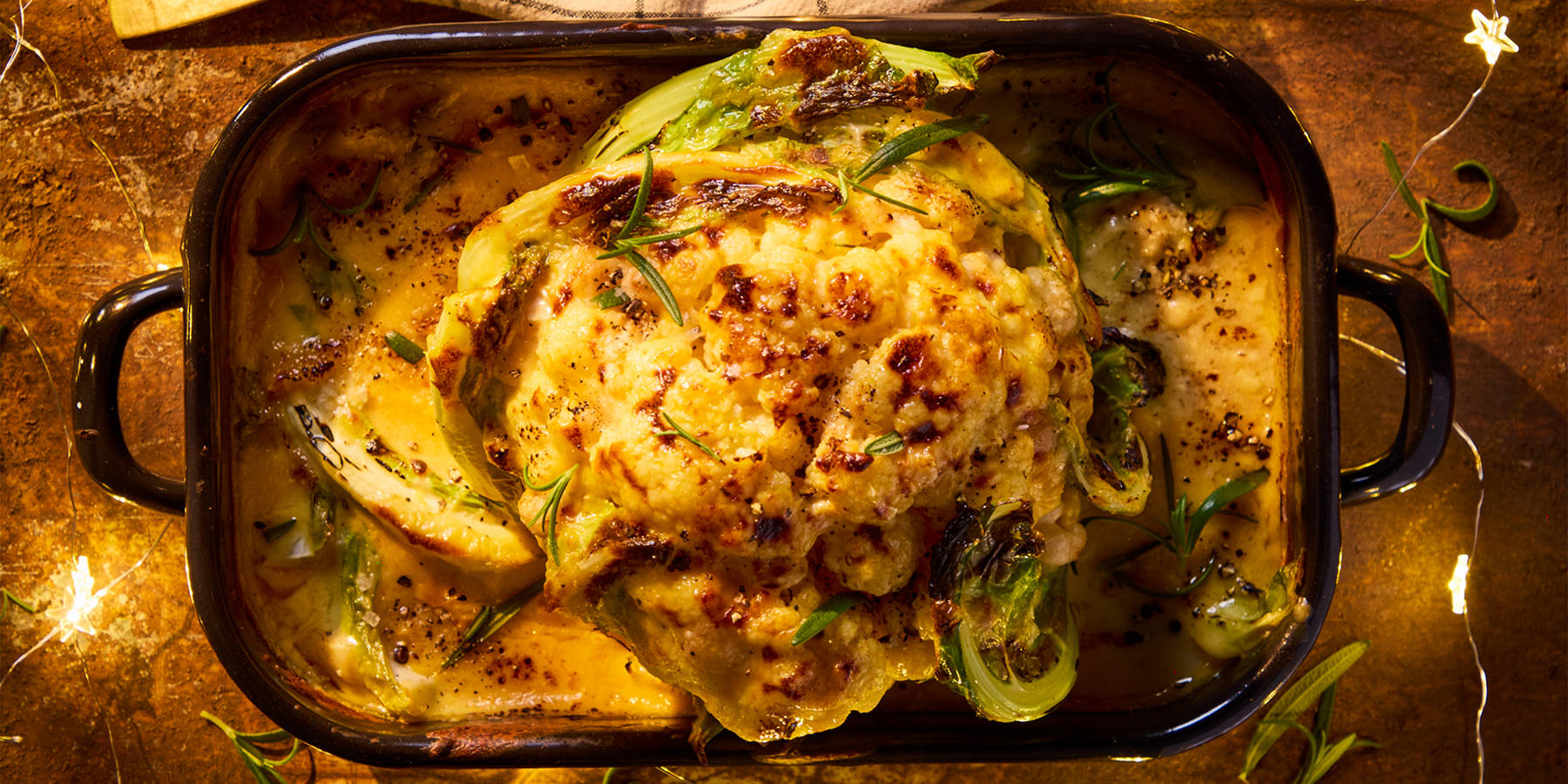 - Put the cauliflower in the dish, pour over the sauce, add the sprigs of rosemary and sprinkle over the remaining cheese.