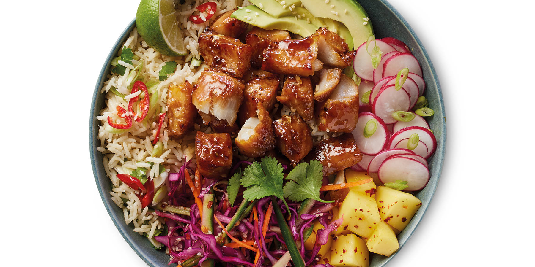 - Top the rice with the teriyaki cod pieces, slaw and the remaining toppings and serve.