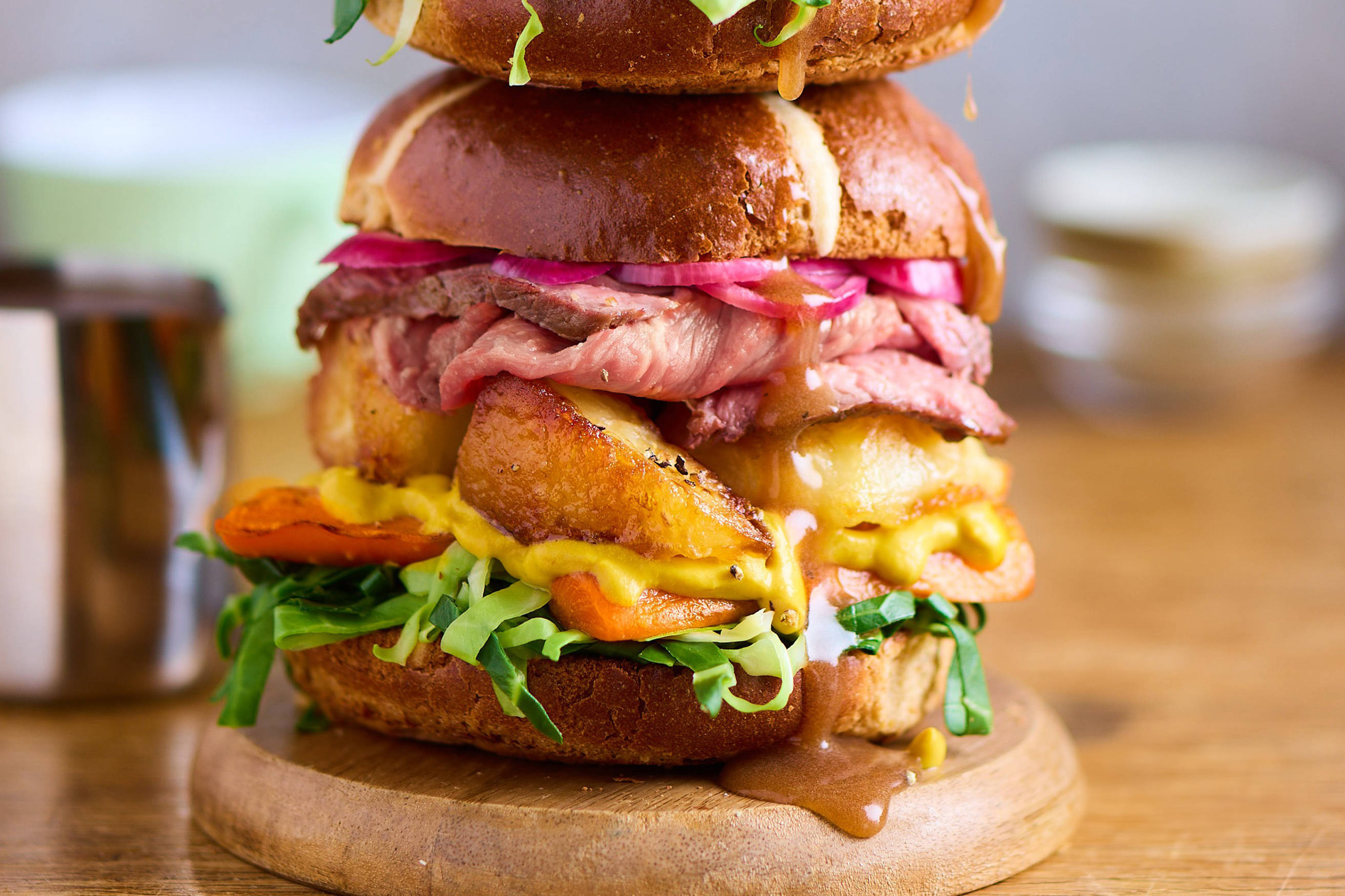 - Layer the cabbage, carrots, roast beef, potatoes, mustard, and onions on the bun, then add the top of the bun.