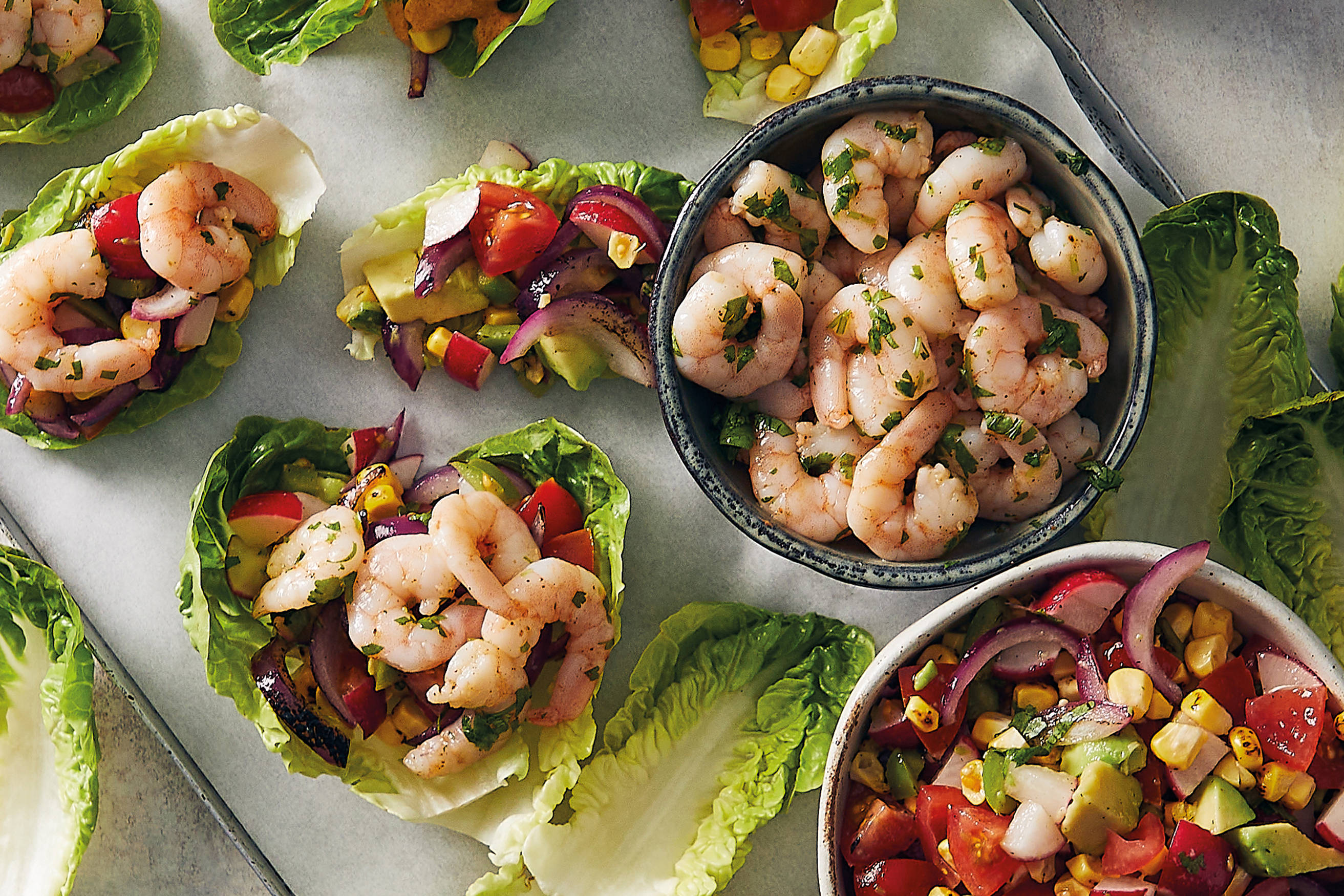 Succulent prawns in a bed of fresh, zesty veg wrapped in crunchy lettuce.