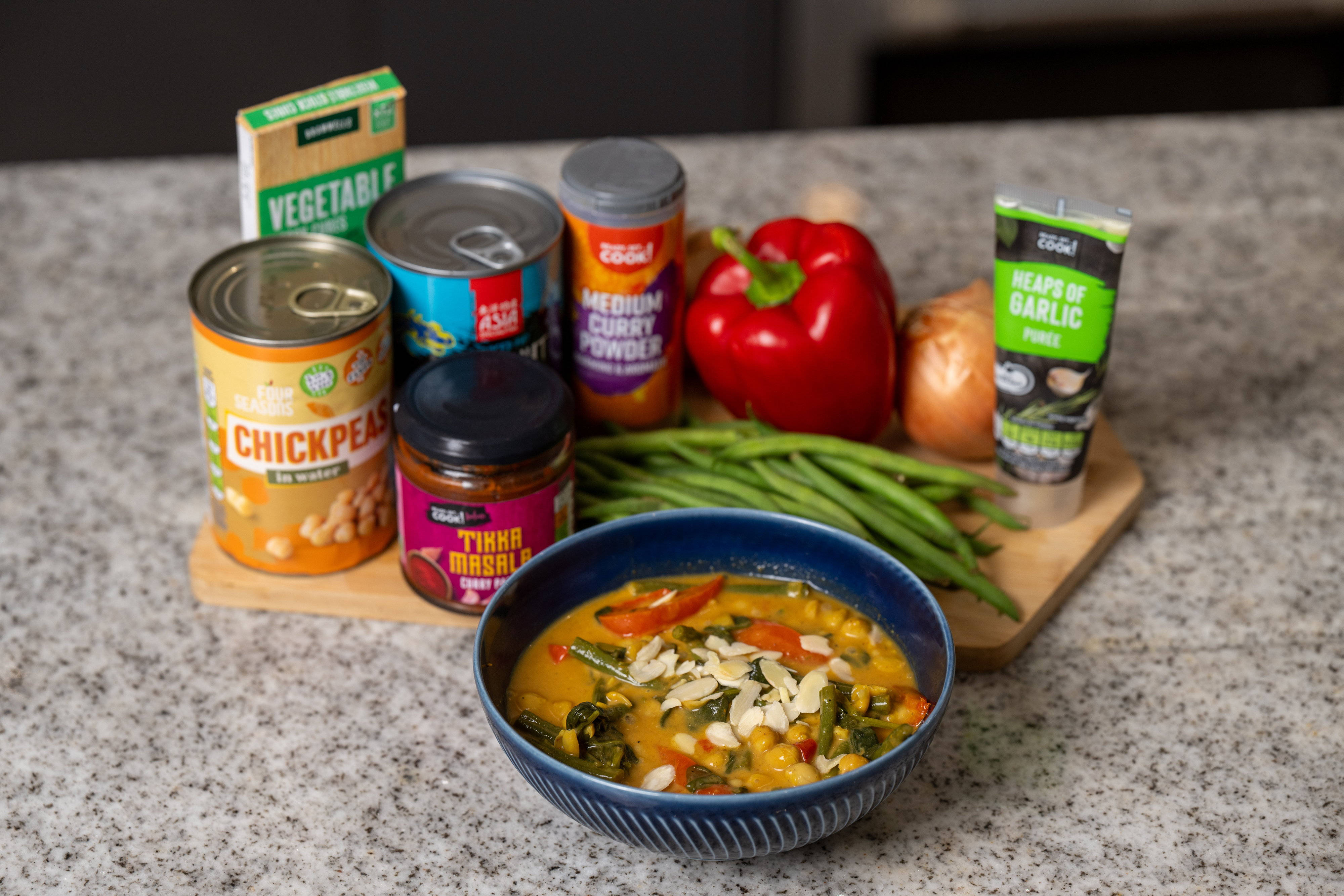 - Meanwhile, heat olive oil in a pan. Add curry powder, paste, and garlic; cook for 30 seconds. Stir in beans, pepper, chickpeas (with liquid), coconut milk, and stock cube. Bring to the boil, then simmer 10 minutes until beans soften.