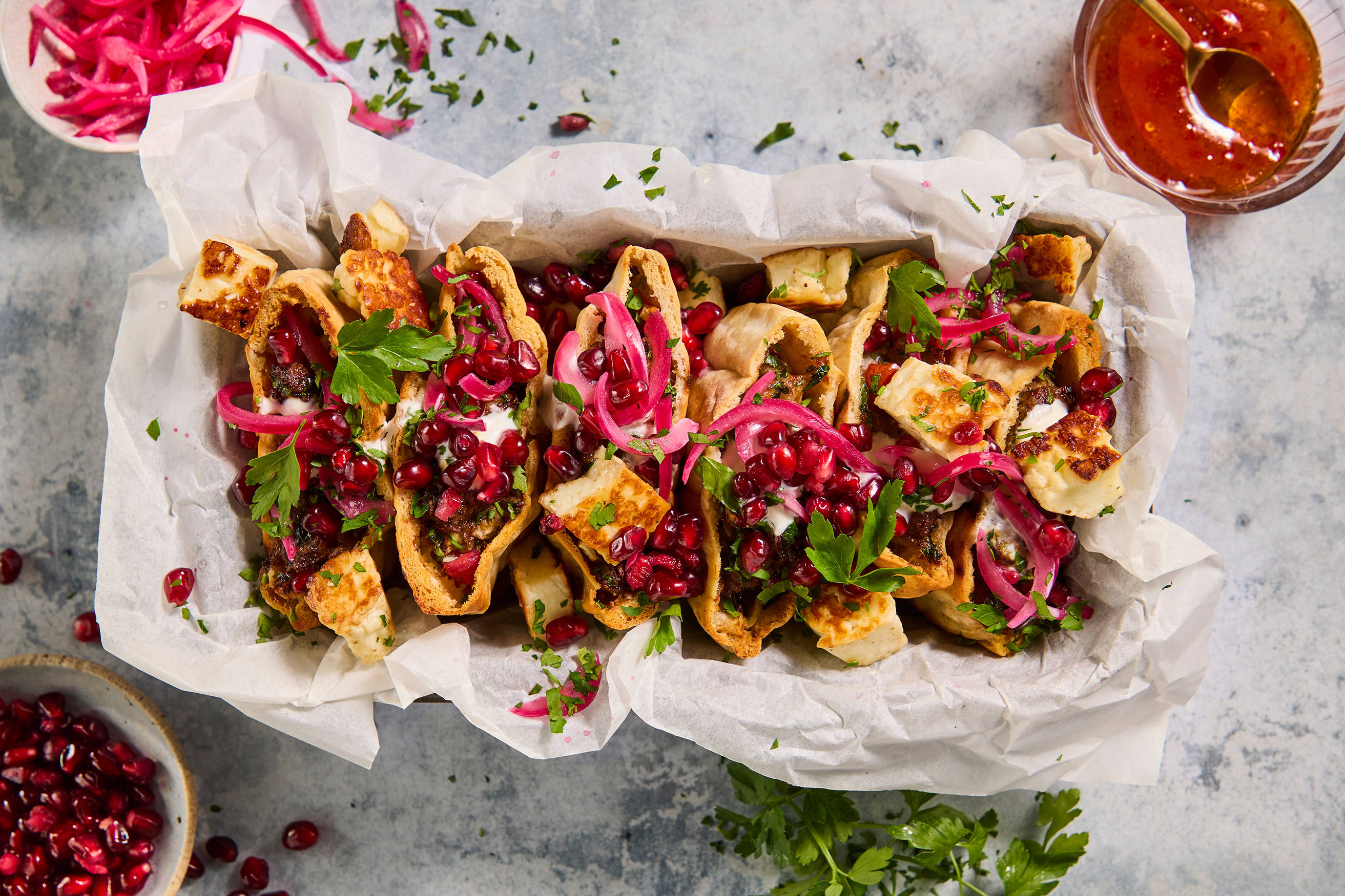 - Top the Arayes with yogurt, pickled onions, pomegranate seeds, halloumi and parsley. Serve them straight from the tray.