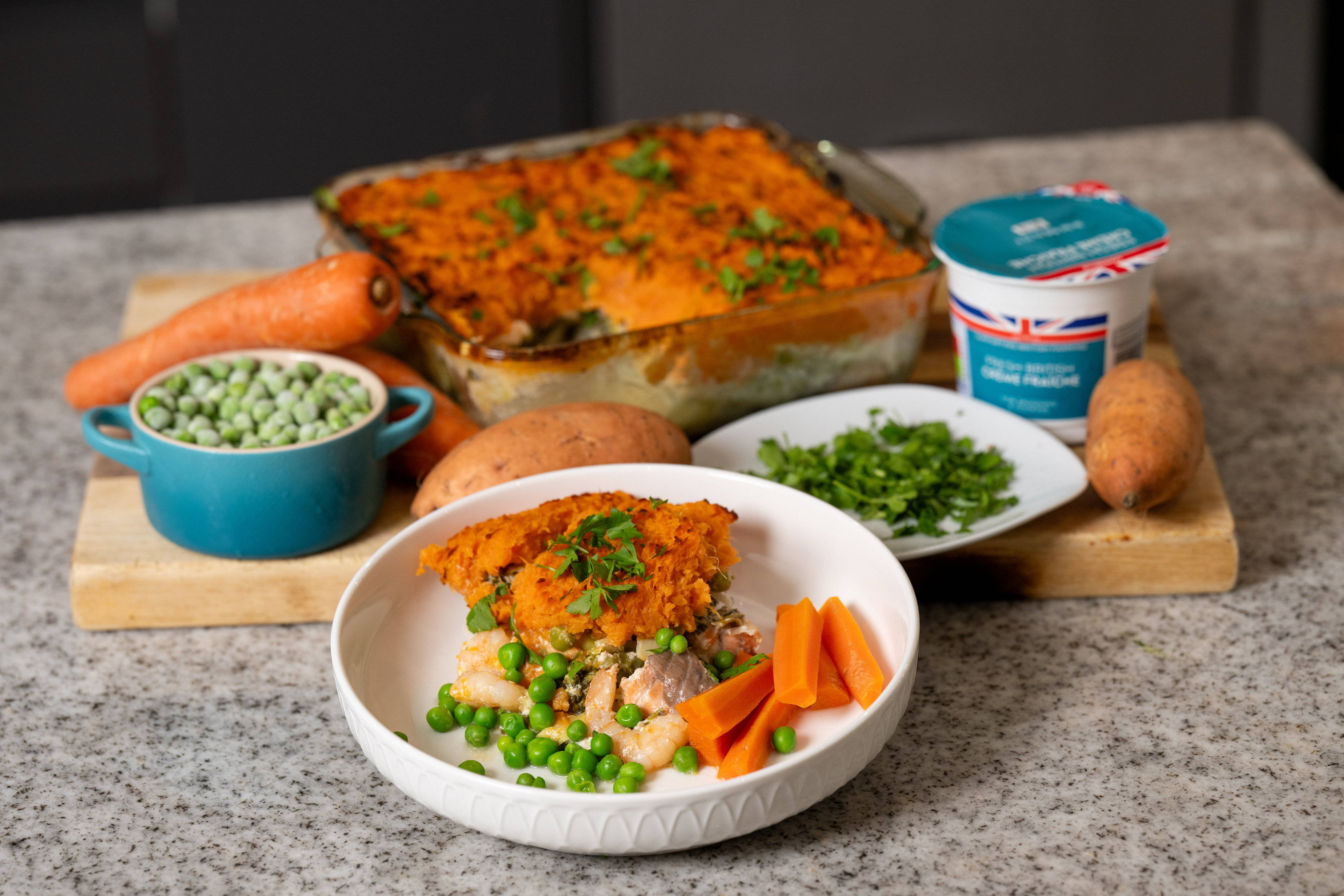 - In an ovenproof dish, layer the salmon chunks and prawns. Pour over the vegetable and parsley sauce, then top with the mashed sweet potato. Use a fork to spread evenly, pressing the edges to seal. Sprinkle with parmesan.