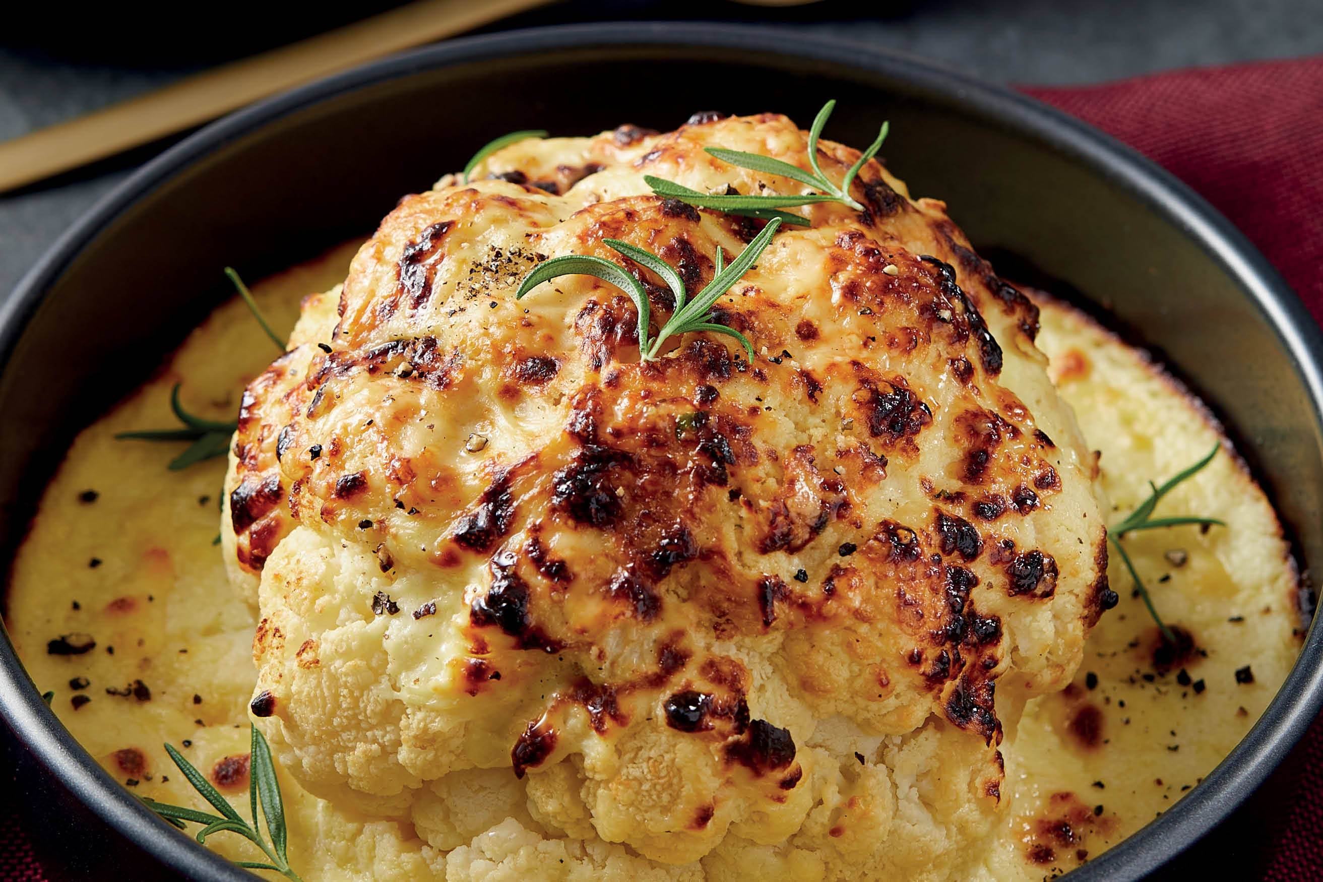 - Once the cauliflower has cooked, remove the tin foil and pour over the sauce.