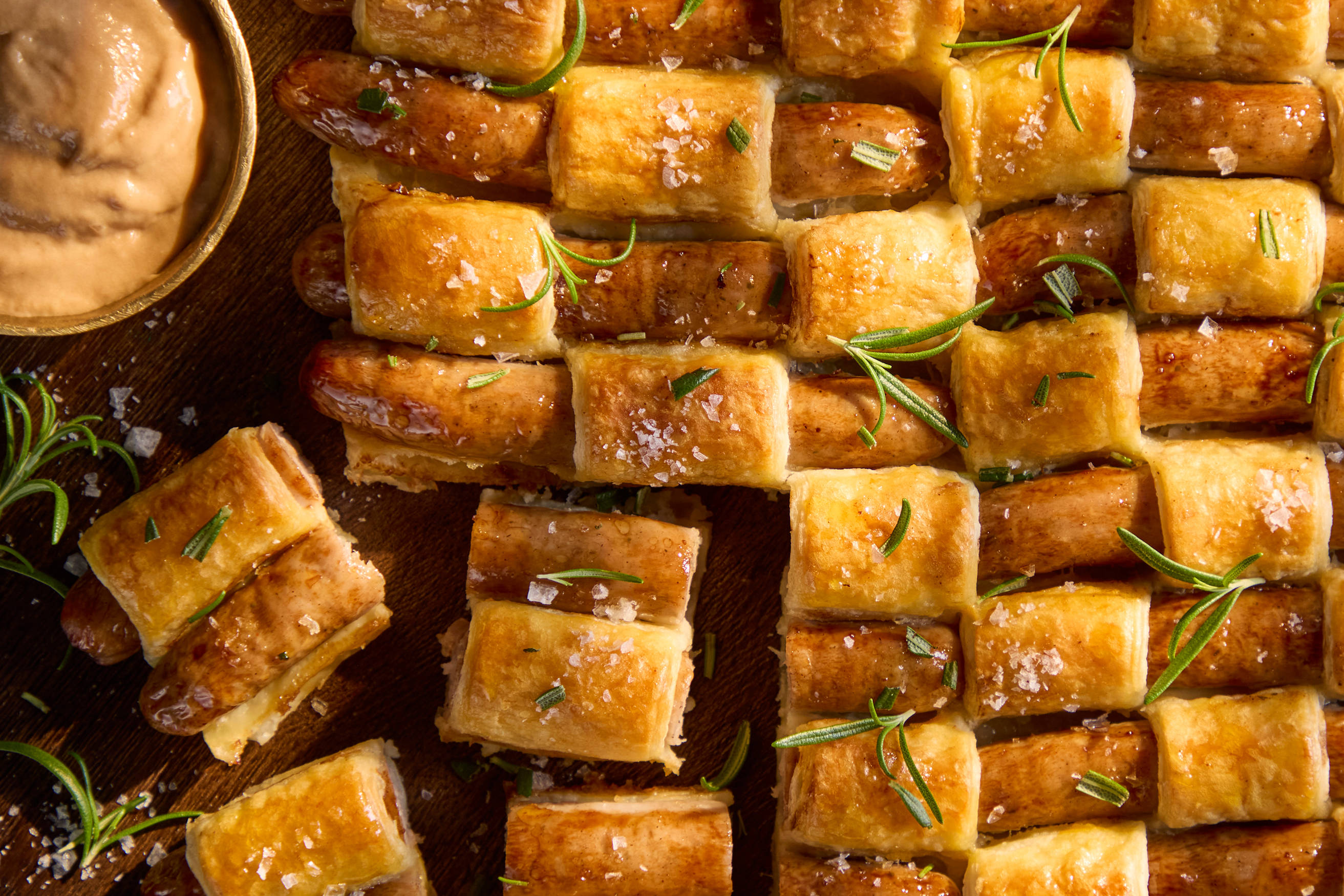 - Plait the pastry around them, adding another line of sausages until you have used them up.