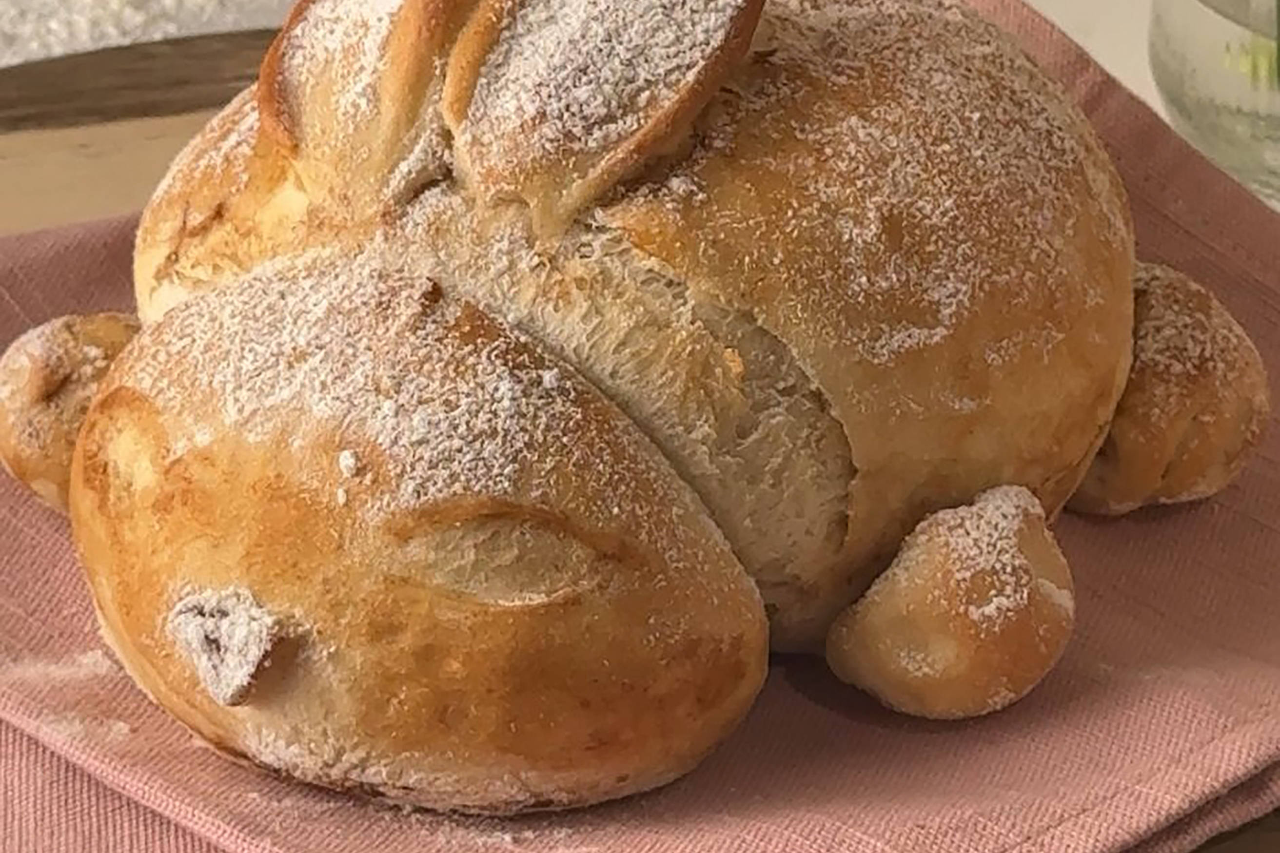 - Carefully lift the bunny shaped dough into the cast iron dish and place it in the oven with the lid on, then bake for 30 minutes.