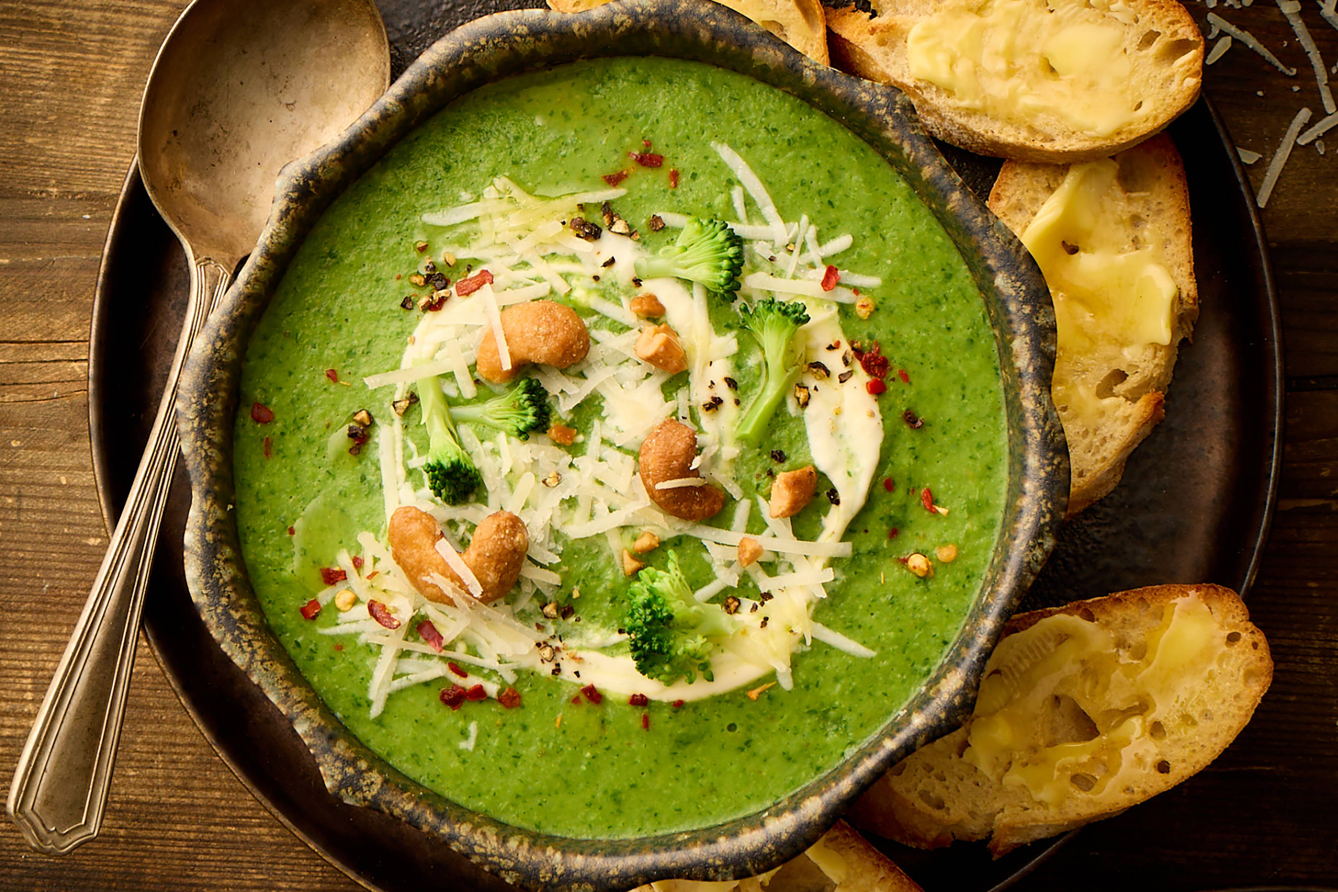 - Serve with a swirl of creme fraiche, a splash of olive oil some sliced jalapeños, chilli flakes, the reserved broccoli florets and cashews.