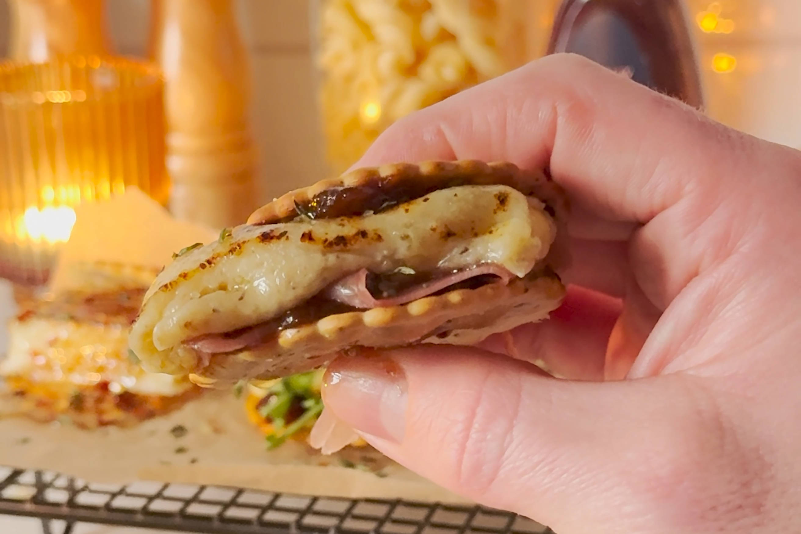 - Press the caramelised cheeses between the different crackers, garnish with fresh thyme and serve warm.