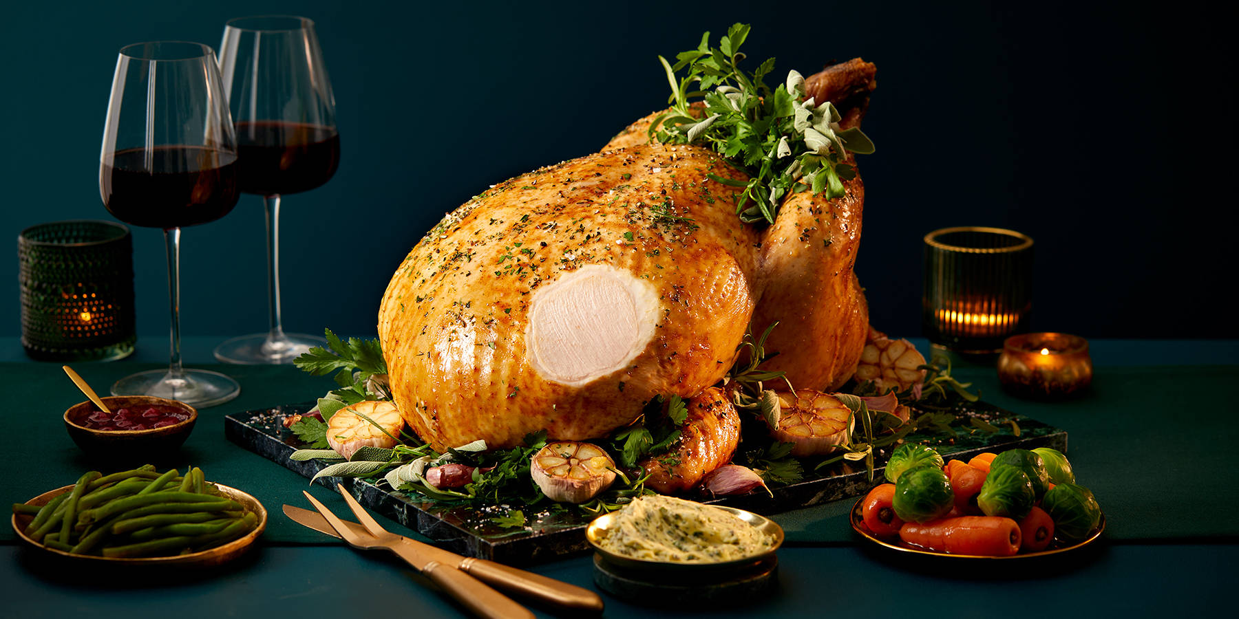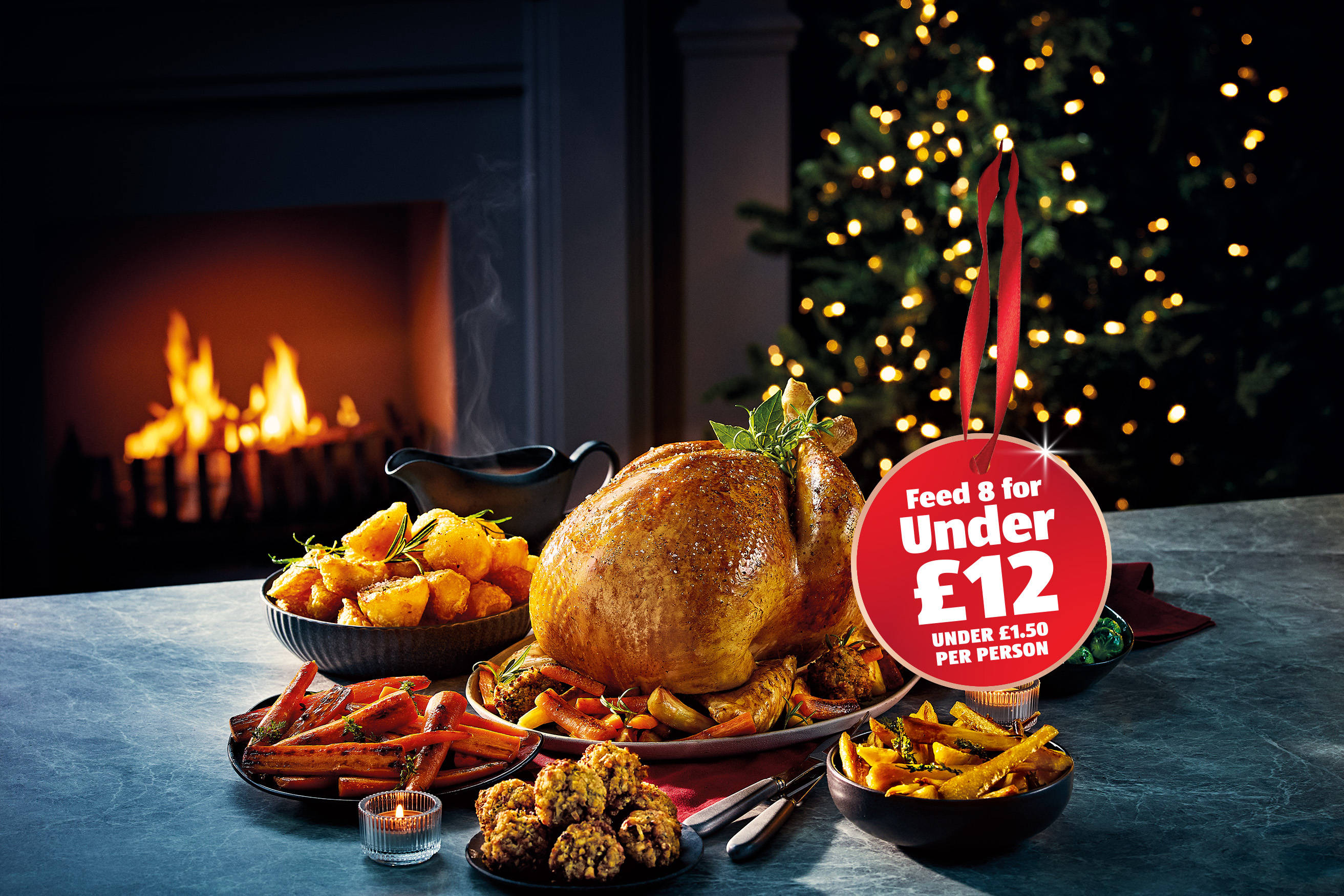 Photography shows serving suggestion. Selected products only. Only £1.48 per person based on a meal for 8. Full product details: Small Fresh British Turkey 3.05kg £9, £2.95 per kg. White Potatoes 2kg 8p, 4p per kg. Brussels Sprouts 500g 8p, 16p per kg. Carrots 1kg 8p, 8p per kg. Parsnips 500g 8p x 2, 16p per kg. Quixo Sage & Onion Stuffing Mix 170g 45p x 2, 26.5p per 100g. Quixo For Meat Gravy Granules 300g £1.09, 36.3p per 100g. Everyday Essentials Yorkshire Puddings 230g/15 pack 46p, £2.00 per kg. Feed 8 for under £12 calculation based on Small Fresh British Turkey weighing 3kg. Offer available between 19/12/2025-24/12/2025. Subject to availability. While stocks last. Products and prices may vary in store, Scotland, Wales, Aldi Local and online.